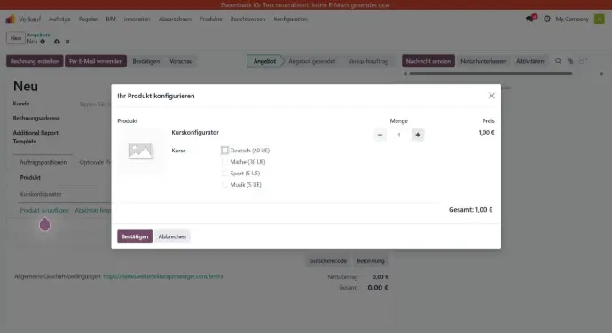 Mit dem Odoo Kurs Konfigurator erstellen Sie Kurse modular und flexibel. Inhalte, Termine, Dozenten, Preise, Förderarten und Zusatzleistungen lassen sich dynamisch kombinieren. Nutzer sehen ausschließlich die Optionen, die zu ihrer Auswahl passen – klar, verständlich und fehlerfrei.